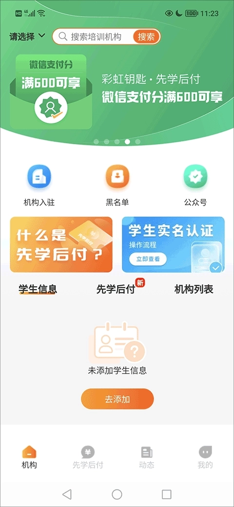 彩虹钥匙先学后付电商管理平台作为一款SaaS平台产品,为培训机构提供“先学习、后付费”的售课模式与运营大数据服务,它不仅是国内唯一提供课时费用资金兜底服务的平台,同时也是微信支付分先学后付接入的唯一服务平台。