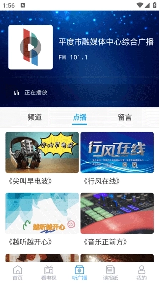 3、在听广播里,以后可以在频道进行实时收听,也可以在点播页面查找自己想听的栏目