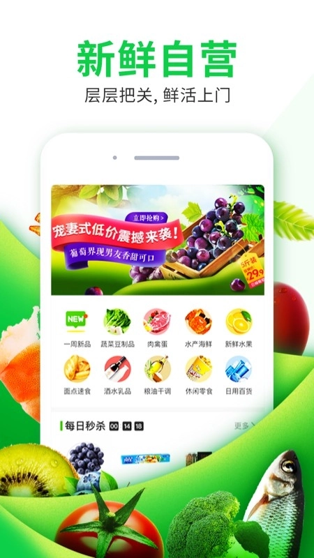 新颖蔬菜、肉禽蛋类、水产海鲜、生活百货、酒水饮料、休闲零食、粮油干