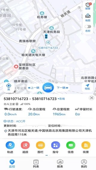 3、设备连接完成之后,进入程序,我可可以查看到车辆的状态,同时还提供了轨迹、追踪、指令等等功能;