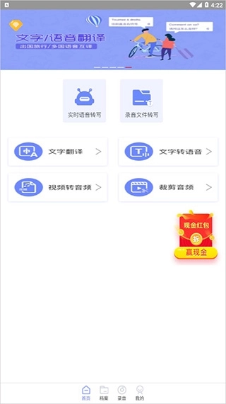 1、打开录音转文字备忘录app,首页如下图所示,拥有文字翻译、文字转语音、视频转音频、裁剪音频四大功能;