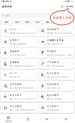 2、打开练字大师app,点击首页右上角的“导入字体”按钮;