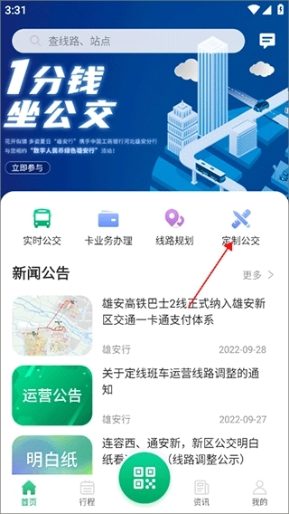 1、启动雄安行app,进入首页后,找到并点击“定制公交”选项