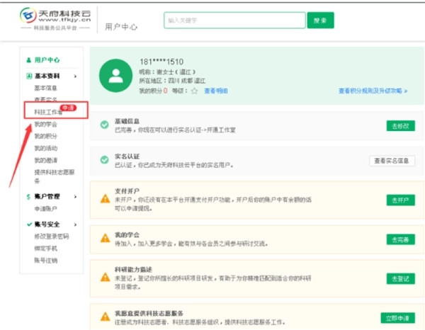 5、审核成功后左边基本资料栏,出现科技工作者申请选项,点击科技工作者。