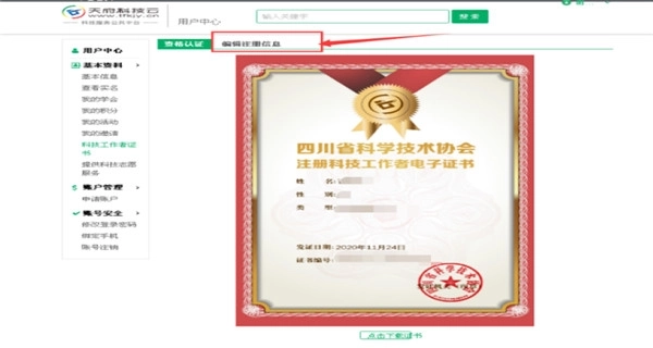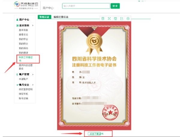7、提交成功,待审核通过后,刷新页面,进入“用户中心”,点击“科技工作者证书”,进行查看,也可根据情况,点击“下载证书”。