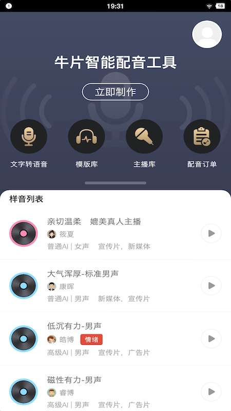 牛片配音app是一款实用的手机配音工具,其安卓版本功能丰富,包含文字转语音、模板库、主播库、配音订单等模块,能为用户提供诸多帮助,方便用户自由配音,解决各类配音问题,让用户可随时在线配音,实现文字快速转化为声音,轻松完成转换,节省大量时间;软件支持多种声线,便于用户选择使用,让配音更简单便捷,在线即可轻松完成,操作简单,新手也能快速上手;用户只需输入文字内容,挑选合适音效就能完成配乐,快速生成配音内容,享受优质配音服务。