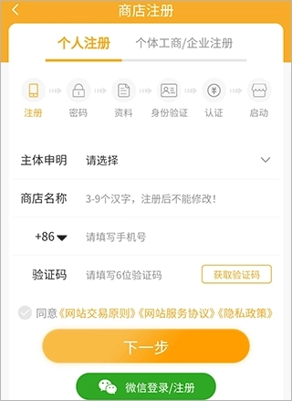2、先选择个人或商户类型,接着选择主体申明选项,输入商店名称、手机号码以及验证码后,点击下一步并按照页面提示完成后续操作,就能成功开店了。