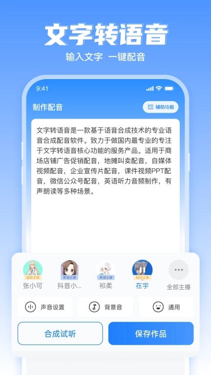 1、语音合成:输入文字后一键即可转换为语音音频,能提供超级自然、清晰且流畅的语音效果