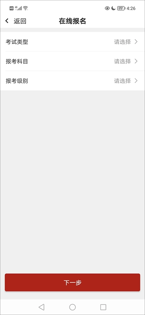 3、接着,在在线报名中选择好考试类型、包括科目和报考级别后,点击下一步;