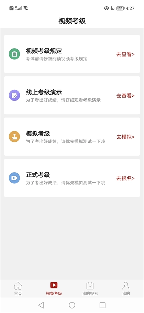 正式考级,在“在线报名”列表中选择已报名成功且已缴费的线上考试,点击开始考试,按照不同专业的要求,完成考试,预览录制的视频,并上传视频;