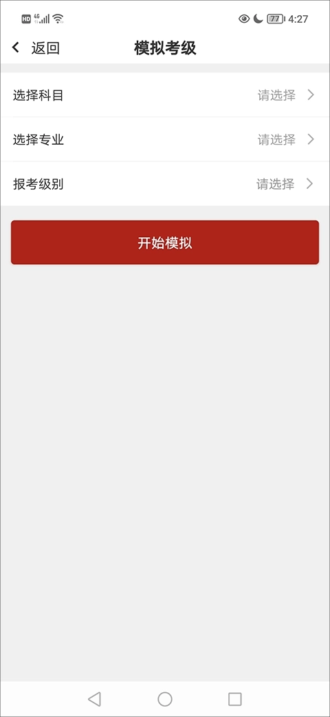 3、接着在模拟考试当中选择好科目、专业、报考级别后找到并点击“开始模拟”;