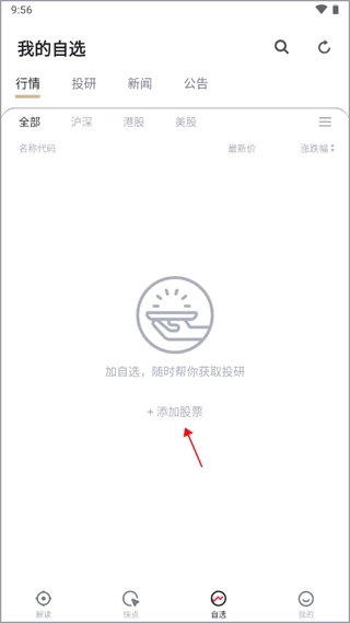 1、打开软件进入主界面后,点击底部菜单栏的“自选”选项,进入行情模块,再点击页面中间的“添加股票”按钮。