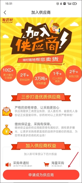 3、页面介绍了加入供应商的权益和要求,点击“申请成为供应商”。