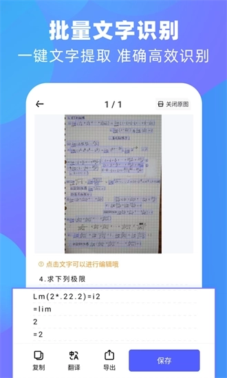 可对各类文档、图片、书籍、名片、海报等进行扫描识别,从中提取所需文字,并能对识别出的内容开展编辑、复制与分享操作;同时支持手写识别,且能精准提取相关内容。