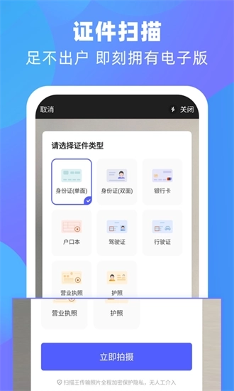 可识别扫描身份证、银行卡、护照等各类证件,自动生成对应的电子版文件,同时为其添加水印标识。
