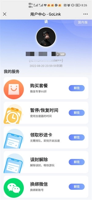 2、进入用户中心后,可以看到GoLink公众号提供了购买套餐、暂停/恢复时间、领取秒进卡、误封解除和换绑微信五个服务功能,点击领取秒进卡。