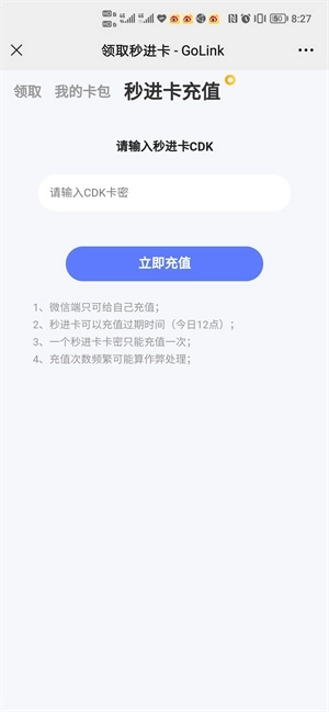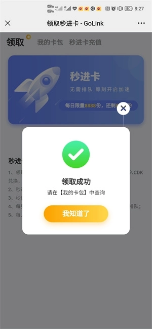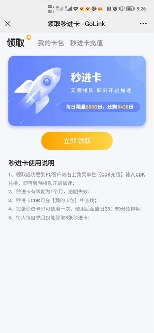 4、了解规则后,可以开始领取秒进卡CDK。