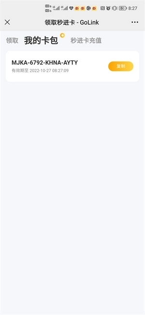 5、领取后,点击“我的卡包”,在我的卡包中可以看到有一个CDK,记住这个CDK,也可以直接复制这个CDK。