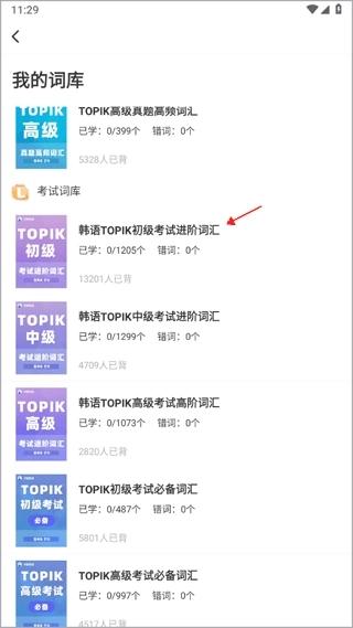 2、点进去之后,页面上会显示很多不同分区的词库,有延世教材,常用词库等,如果需要备考韩语就可以选择考试词库了。