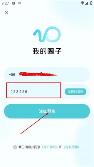 2、在我的圈子页面输入手机号,点击发送验证码。