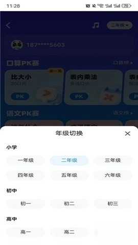 2、点击右上角的按钮,就能切换不同的年级,小朋友可以先和同年级的对手一较高下。