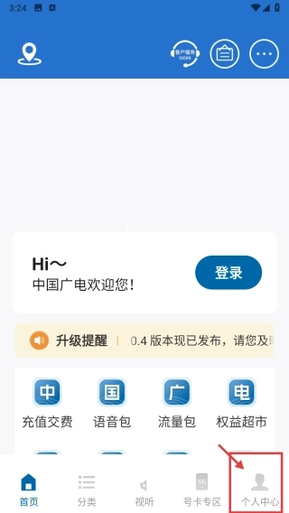 1、打开中国广电首页,点击底部个人中心选项,进入我的页面。