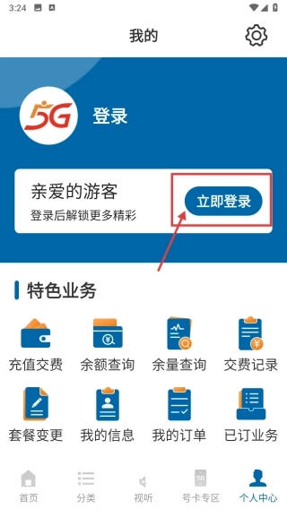 2、在我的页面,点击立即登录按钮,进入登录方式选择界面。