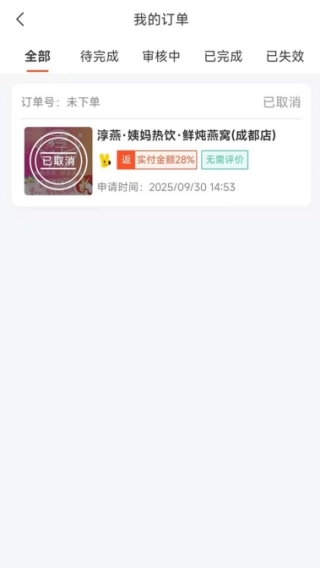 2、按类别展示待完成、审核中、已完成、已失效的订单,可详细查看订单申请时间、返利比例等关键信息。