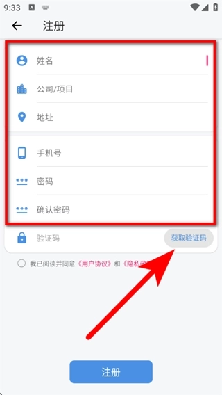 3、在注册页面,输入手机号和设置密码,点击获取验证码。