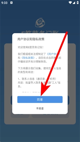 1、启动E筋劳务记账应用,点击弹出窗口中的同意按钮,即可进入登录界面。