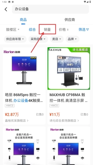 在办公设备的商品页面,点击“销量”选项,即可按照销量对商品进行排序。