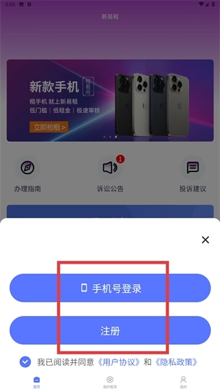 3、点击【信用租机】后,会弹出登录注册选项,可选择【手机号登录】或【注册】,同时需勾选协议确认。
