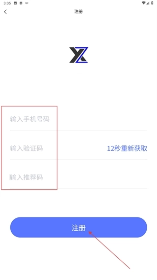 4、在注册界面,依次输入【手机号码】、获取并填写【验证码】,选填【推荐码】后点击【注册】完成账号创建。