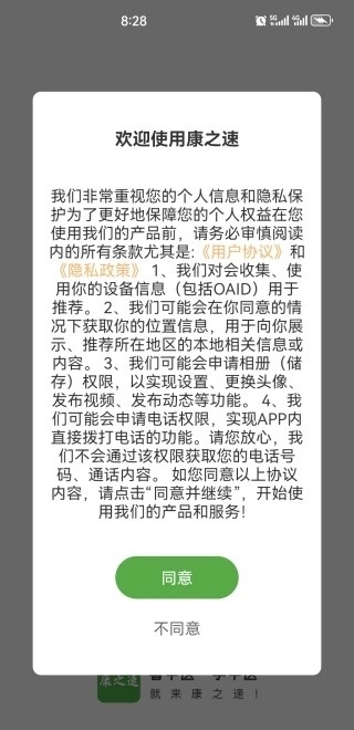 1、打开软件产看用户协议和隐私政策,点击同意即可开始使用。