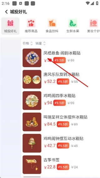2、在市民产页面点击目标选项,进入城投好礼的商品列表页面。