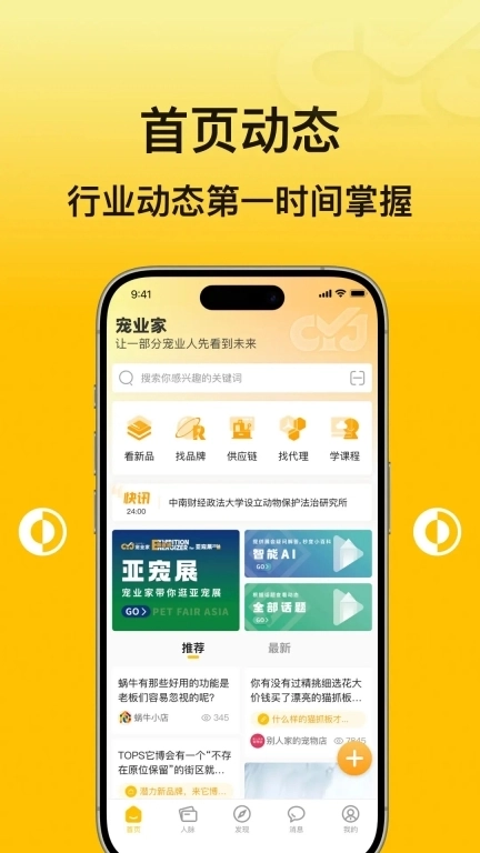 宠业家软件为宠物行业从业者打造了一个信息共享与交流的专属平台。在这里,用户可以便捷地获取行业最新资讯,及时掌握市场动态和行业发展趋势。软件除了支持实时更新的新闻推送外,还整合了各类展览活动的详细信息,助力用户精准把握行业机遇。平台同时汇聚了丰富的品牌资源,用户能够在此了解相关企业的最新动态,从而有效促进业务合作与交流。