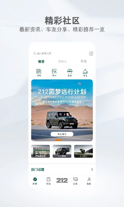 212越野车是一款面向越野爱好者的综合性应用,为用户整合了丰富的越野相关资源与互动交流空间。它不仅涵盖越野驾驶、车辆改装及养护等专业内容,还配备智能化服务功能,助力满足用户在越野活动中的各类需求。借助该应用,用户能便捷获取最新越野资讯、参与社区话题讨论、结识同好伙伴,进而增强越野活动的趣味性与体验感。