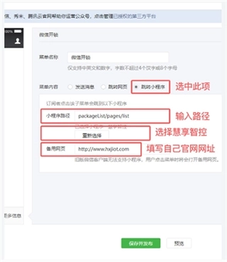3、根据页面填写信息:菜单内容选择跳转小程序,填写小程序路径: packageList/ pages/index,小程序搜索选择:慧享智控,填写备用网页:酒店/公寓自己的;