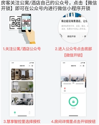 (需要公众号先关联小程序,才能实现关注酒店/公寓自己的公众号来进行微信开锁)