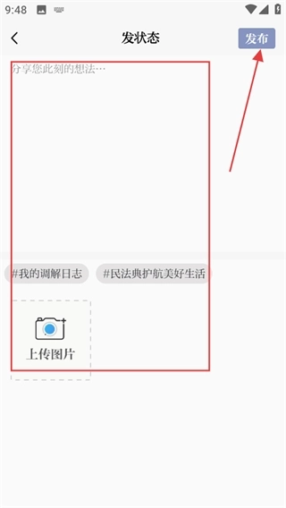 3、在发状态页面,输入信息后点击发布可发布文章。