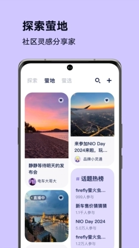 firefly萤火虫是蔚来汽车推出的专属交流平台,服务于蔚来智能电动小车的车主群体。平台上,已购车的用户可以进行车辆选配操作,还能与其他萤火虫车主互动交流,分享作为车主的使用体验、车辆优势及有待改进之处;有意向购入该车型的用户,也可在此咨询和探讨关于车辆的各类问题。此外,平台会定期组织车友旅行活动,召集车主们与周边同车型车主一同自驾出游,以此加深车企与车主之间的情感联系。