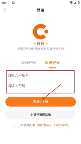 4、在密码登录页面,依次填写“请输入手机号”和“请输入密码”对应的内容后,点击“登录/注册”按钮。