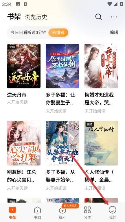 在书架页面,点击底部的【我的】按钮,即可进入个人中心页面。