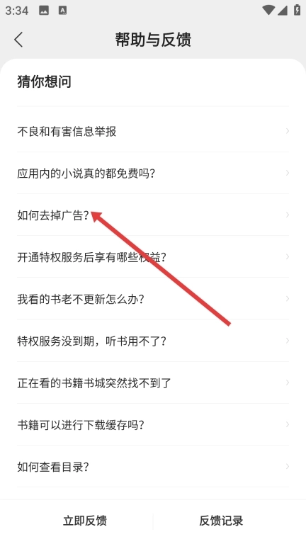 3、在帮助与反馈界面,点击【如何去掉广告?】问题,进入问题详情界面。