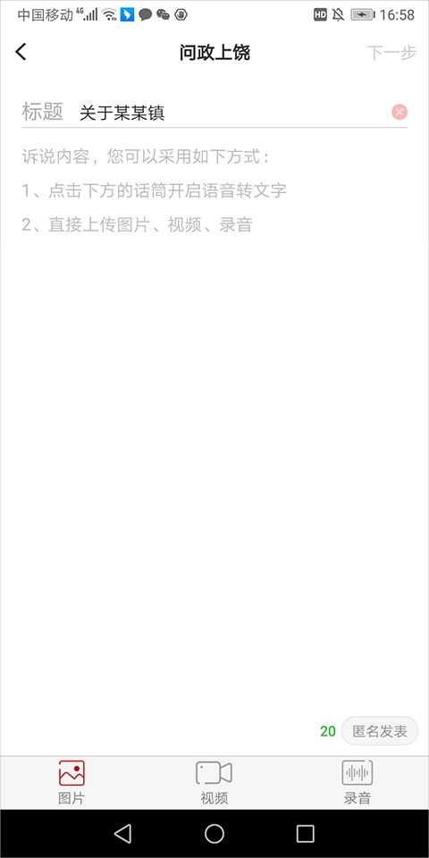 2、进入编辑页面后,用户可在此编辑内容以反映党风政风问题,点击页面下方的图片、视频、录音按钮,即可直接进行拍照、录像或录音操作。