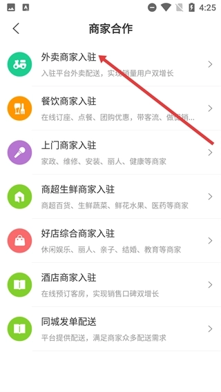 3、在商家合作页面,选择【外卖商家入驻】选项,可入驻平台外卖配送,实现销量与用户的双重增长。