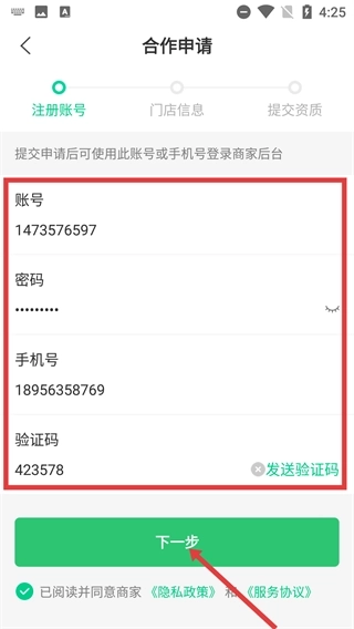 4、在合作申请的注册账号环节,依次填写账号、密码、手机号及验证码,勾选同意相关协议后点击【下一步】按钮,即可推进合作申请流程。