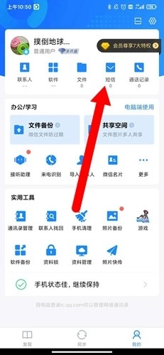 首先打开软件,在完成备份后,点击【我的】进入云端备份数据管理界面,在这里可以看到【短信】选项,点击该选项即可。