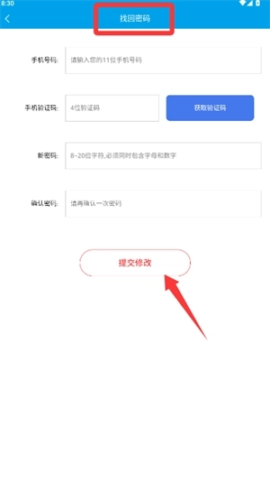 3、若遗忘密码,可通过“找回密码”输入手机号等信息并提交修改。