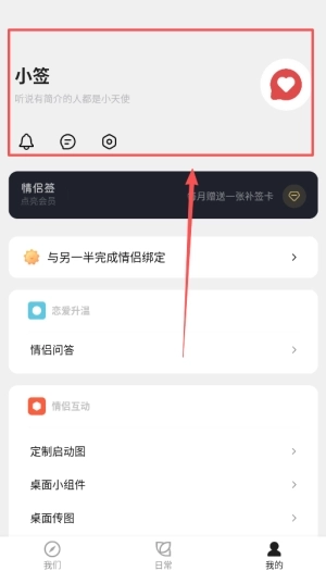 1、首先,安装情侣签并注册账户,进入主界面后可以创建属于你们的专属空间,让每一个瞬间都有迹可循。
